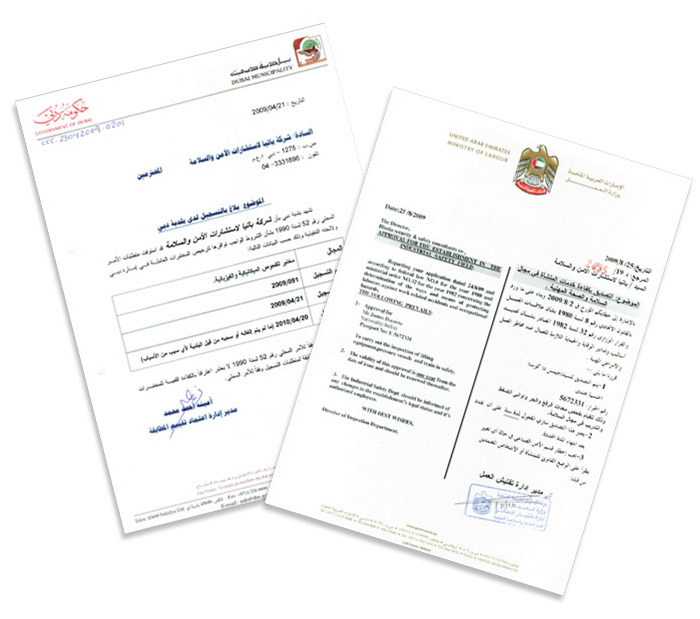 BSS is registered with the U.A.E. Ministry of Economic Department and Dubai Municipality as a Mechanical and Physical Testing Company and approved by UAE Ministry of Labour to carry out inspection, testing and certification of Lifting Equipment and Pressure Vessels.