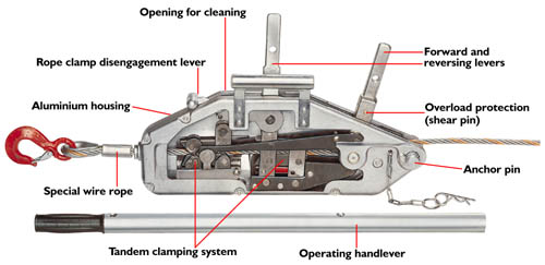 Yaletrac® cable pullers feature a lightweight, compact, high strength aluminium housing, smooth contour design with a large, flat bottom surface for increased stability in horizontal and vertical working positions. Forward and reversing levers in tandem provide slim design and assure power transfer along the centre line. Overload protection is by a shearing pin in the foward lever. Spare shear pins are conveniently located in the carrying handle or operating lever. A broken pin can be replaced without removing the load. A lever disengages the rope clamp system allowing easy, smooth installation of the wire rope. Yaletrac® uses a special flexible wire rope. It has six strands with a steel core and is identified by an orange strand. The rope is tapered at one end for easy threading and fitted with a safety hook on the other end. The parallel arrangement of the clamping system protects the wire rope by distributing the clamping forces evenly. A long rope advance per each lever stroke increases the working speed. The large opening in the top of the unit allows easy cleaning: simply flush the unit with water, apply motor oil for lubrication and the Yaletrac is again ready for use.